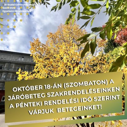 Tisztelt Betegeink! 2025. október 18-án (szombaton) Kórházunk járóbeteg szakrendelései és időpont egyeztetési lehetőségei a pénteki rendelési idő szerint állnak pácienseink rendelkezésére. Jó egészséget kívánunk! Dél-budai…