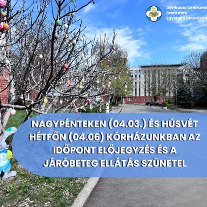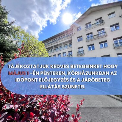 Tájékoztatjuk kedves betegeinket, hogy a Húsvéti ünnepek alatt Nagypénteken (04.03) és Húsvét hétfőn (04.06.) kórházunkban a járóbeteg rendelések és az előjegyzések szünetelnek. Megértésüket köszönjük! Április…