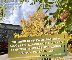 Tisztelt Betegeink! 2025. október 18-án (szombaton) Kórházunk járóbeteg szakrendelései és időpont egyeztetési lehetőségei a pénteki rendelési idő szerint állnak pácienseink rendelkezésére. Jó egészséget kívánunk! Dél-budai…